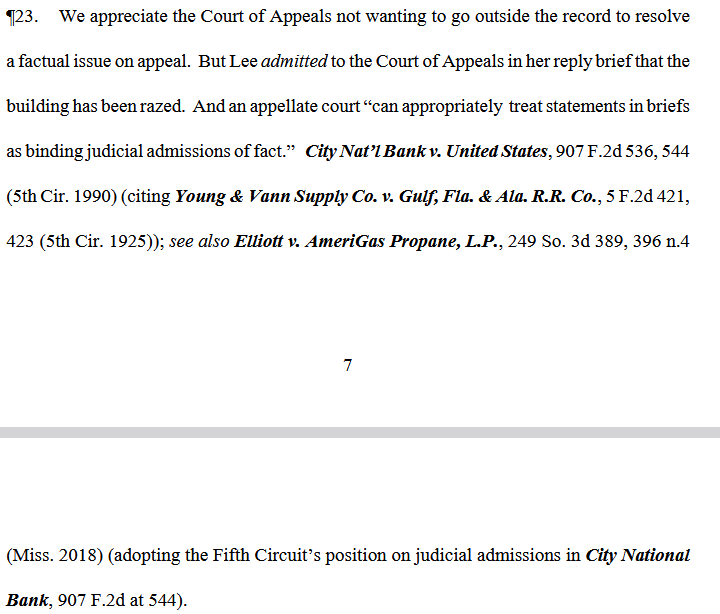 Practice Point – The Mississippi Supreme Court relied on Fifth Circuit precedent and held that appellate courts can treat statements in briefs as binding admissions of fact: