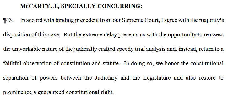 Note – The constitutional right to speedy trial got a lot of air time today. Here is how McCarty’s special concurrence on the subject kicks off: