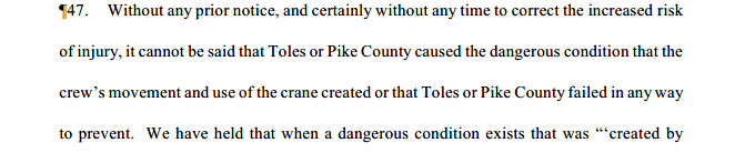 The Court of Appeals then addressed the dismissal of the claims against Pike County and Toles, holding that the circuit court did not err in finding that the dangerous condition was open and obvious, was not created by the government’s negligent maintenance or repair and it, and was not caused by Toles. The Court noted that the issue of whether a danger is open and obvious is usually a question for the trier of fact, but that there are cases where conditions are so clearly dangerous that the issue can be decided as a matter of law. The Court also held that neither Pike County nor Toles could be liable for causing a dangerous condition created by a third-party without notice and sufficient time to correct the dangerous condition: